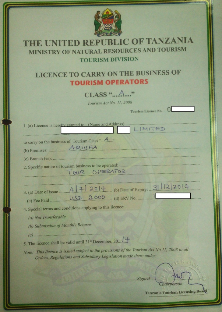 document type Tourism licence